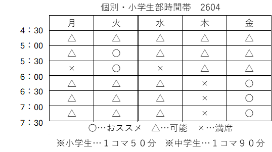 ・月~金の夕方の時間を使って、1回90分の指導となります。